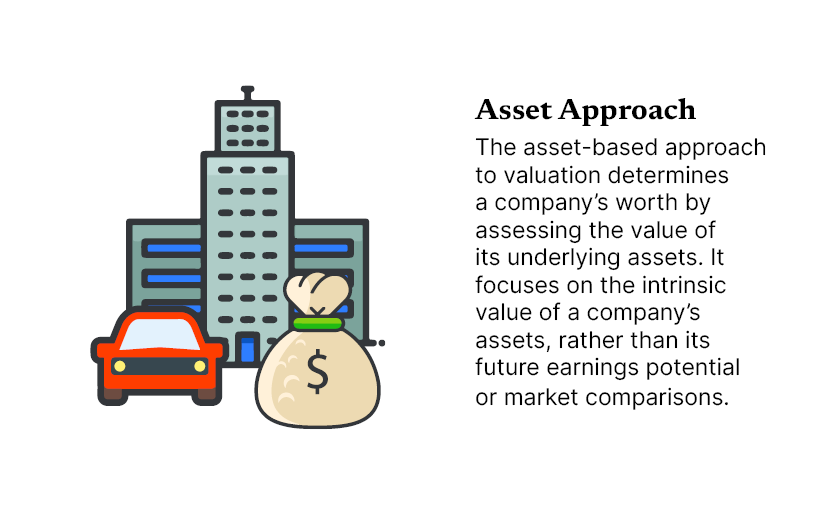 Asset Approach – The asset-based approach to valuation determines a company’s worth by assessing the value of its underlying assets. It focuses on the intrinsic value of a company’s assets, rather than its future earnings potential or market comparisons. This approach involves comprehensively identifying and valuing all company assets, both tangible (e.g., property, plant, equipment, inventory) and intangible (e.g., patents, trademarks, goodwill). Tangible assets may be valued using methods like market value, replacement cost, or liquidation value, while intangible assets often require more complex valuation techniques, such as income-based methods or market-based methods.