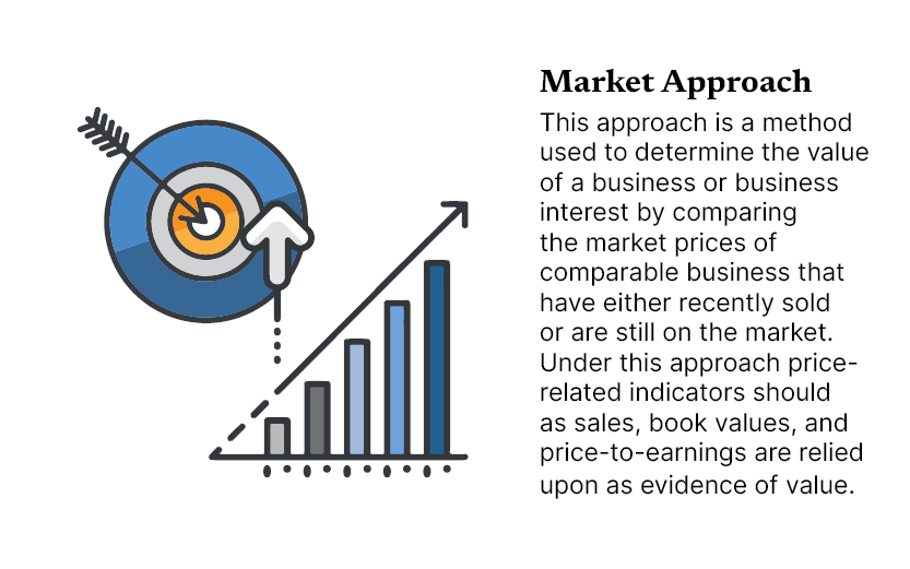 Market Approach – This approach is a method used to determine the value of a business or business interest by comparing the market prices of comparable business that have either recently sold or are still on the market. Under this approach price-related indicators should as sales, book values, and price-to-earnings are relied upon as evidence of value. Types of evidence often include: